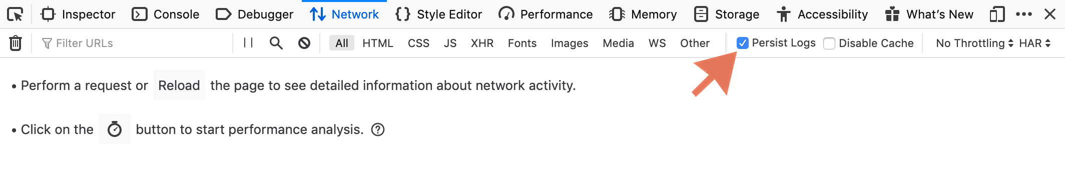 Step 2: Click on Network tab in Developer Tools. Check the "Persist logs" box at the top.